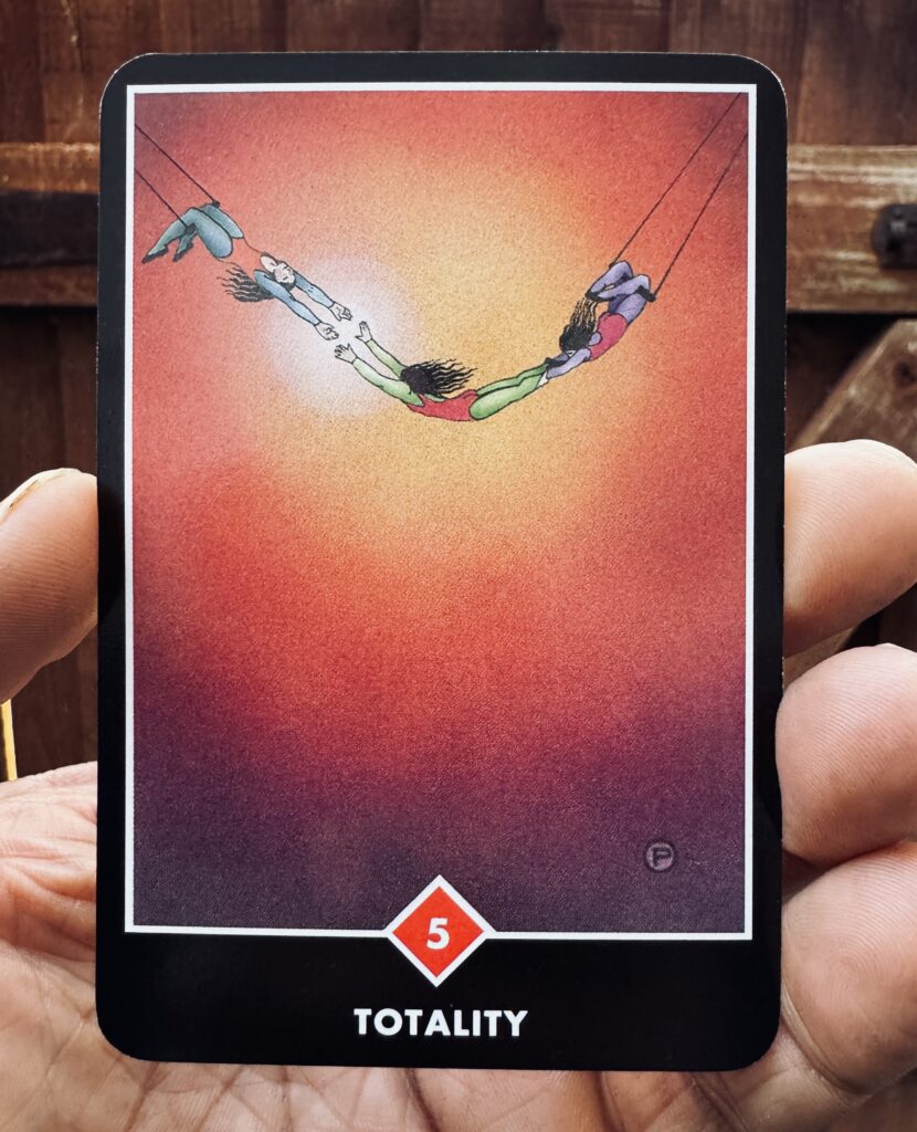 The card Totality captures that split-second moment suspended in trust, focus, and surrender. Three acrobats are mid-air, held not by certainty but by presence—each giving their all, knowing that hesitation would break the arc, and the fall would be inevitable. This is not a card of half-measures. It speaks to the luminous edge where mastery meets vulnerability, where control dissolves into flow.